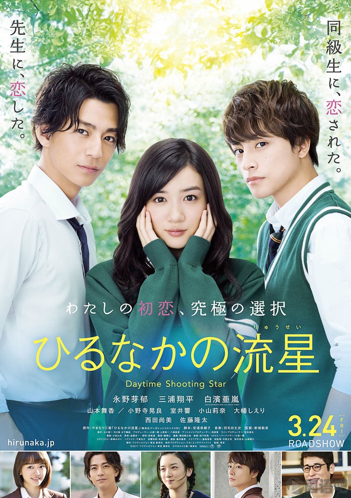 ![]() ◎译 名 昼行闪耀的流星/Daytime Shooting Star/划过青空的火流星/白昼的流星(台) ◎片 名 ひるなかの流星 ◎年 代 2017 ◎产 地 日本 ◎类 别 爱情 ◎语 言 日语/国语 ◎上映日期 2017-03-24(日本) ◎IMDb评分 6.7/10 from 707 users ◎IMDb链接 https://www.imdb.com/title/tt6078842/ ◎豆瓣评分 6.4/10 from 8416 users ◎豆瓣链接 https://movie.douban.com/subject/26873577/ ◎片 长 119分钟 ◎导 演 新城毅彦 Takehiko Shinjo ◎编 剧 安达奈绪子 Naoko Adachi/山森三香 Mika Yamamori ◎主 演 永野芽郁 Mei Nagano 三浦翔平 Shohei Miura 白滨亚岚 Alan Shirahama 山本舞香 Maika Yamamoto 西田尚美 Naomi Nishida 佐藤隆太 Ryūta Satō 石桥宇轮 Uwa Ishibashi 大幡诗绘理 Shieri Ohata 小野寺晃良 Akira Onodera 玉川莲 Ren Tamagawa ◎简 介 与谢野雀(永野芽郁 饰)自幼无拘无束的生长在乡间,性格天真而又开朗。雀考上了位于东京的高中,这也就意味着,她要离开父母,前往这座繁华而又时尚的城市,独自开始新的生活。然而这生活在一开始似乎就并不顺利,在前往叔叔家的路上,雀晕倒了,幸运的是,她遇见了名为狮子尾五月(三 浦翔平 饰)的男子。雀惊讶的发现,狮子尾的后颈上有一颗似曾相识的痣。 第二天来到学校,雀发现,狮子尾竟然就是自己的班主任。之后,她还和邻座的马村大辉(白滨亚岚 饰)结下了一段友谊。随着时间的推移,雀和狮子尾以及大辉之间的关系渐渐暧昧起来,夹在两个男人之间,雀不知道该做出怎样的选择。